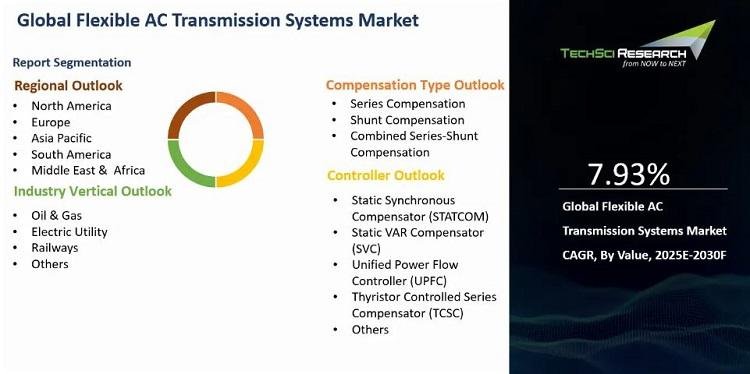 “Flexible AC Transmission Systems Market - Global Industry Size, Share, Trends, Opportunity, and Forecast, Segmented, By Compensation Type (Series Compensation, Shunt Compensation, Combined Series-Shunt Compensation ), By Controller (Static Synchronous Compensator (STATCOM), Static VAR Compensator (SVC), Unified Power Flow Controller (UPFC), Thyristor Controlled Series Compensator (TCSC), Others), By Industry Vertical (Oil & Gas, Electric Utility, Railways, Others), By Region &Competition, 2020-2030F”, has evaluated the future growth potential of Global Flexible AC Transmission Systems Market and provides statistics & information on the Market size, structure, and future Market growth. The report intends to provide cutting-edge Market intelligence and help decision-makers make sound investment decisions., The report also identifies and analyzes the emerging trends along with essential drivers, challenges, and opportunities in the Global Flexible AC Transmission Systems Market.