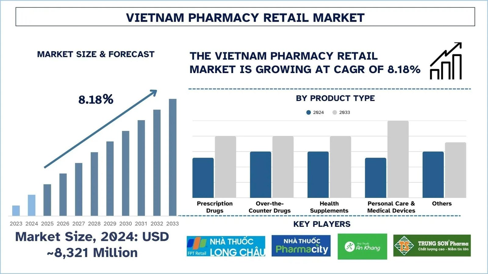 According to the UnivDatos, rising healthcare awareness, growing prevalence of chronic diseases, rapid urbanization, higher disposable income, expansion of organized pharmacy chains, government push for digitalization, and e-prescriptions are driving the Vietnam Pharmacy Retail market. As per their “Vietnam Pharmacy Retail Market” report, the Vietnam market was valued at USD ~8,321 million in 2024, growing at a CAGR of about 8.18% during the forecast period from 2025 - 2033 to reach USD million by 2033.
