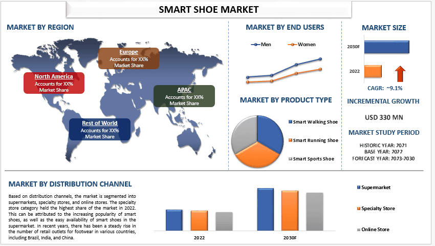 The Smart Shoe Market was valued at USD 170 million in 2022, growing at a CAGR of 9.1% during the forecast period from 2023–2030.