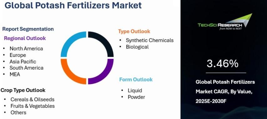 “Potash Fertilizers Market - Global Industry Size, Share, Trends, Opportunity, and Forecast, Segmented By Type (Synthetic Chemicals and Biological), By Crop Type (Cereals & Oilseeds, Fruits & Vegetables and Others), By Form (Liquid and Powder), By Application Method (Seed Dressing, Seed Coating and Seed Pelleting), By Region and Competition, 2020-2030F”, has evaluated the future growth potential of Global Potash Fertilizers Market and provides statistics & information on market size, structure and future market growth. The report intends to provide cutting-edge market intelligence and help decision makers take sound investment decisions. Besides, the report also identifies and analyzes the emerging trends along with essential drivers, challenges, and opportunities in Global Potash Fertilizers Market.