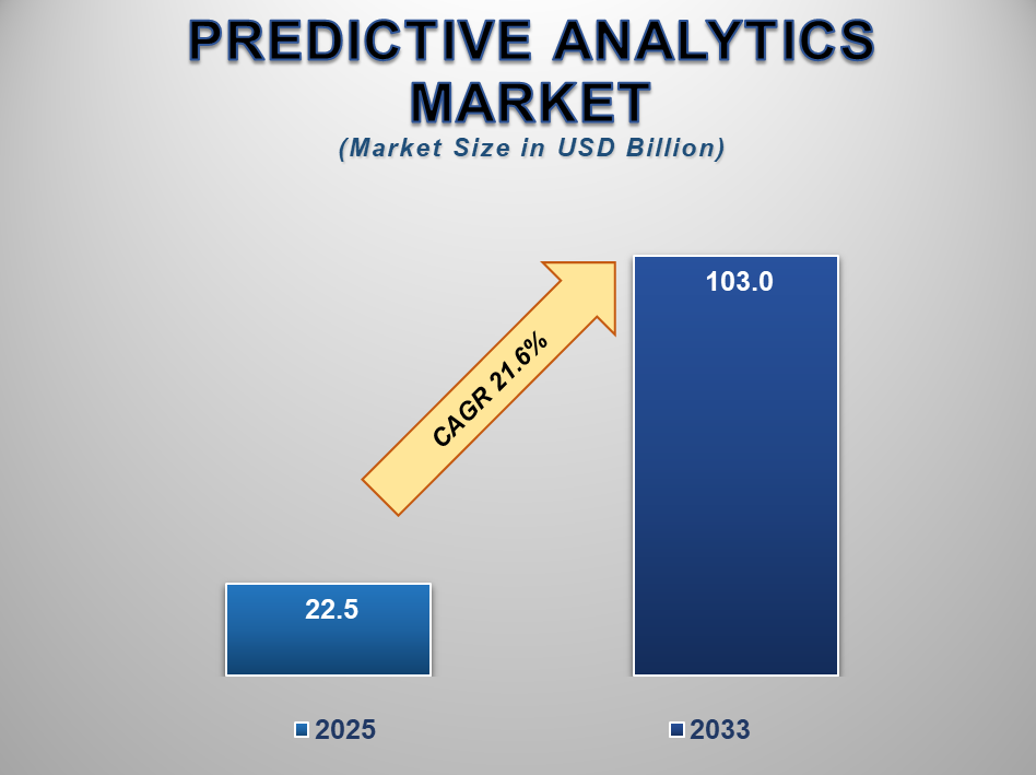 The Predictive Analytics market is anticipated to grow significantly from 2025 to 2033, fueled by the increasing need for data-driven decision-making across industries. By 2025, the market is projected to reach a value of around USD 22.5 Billion. Looking ahead to 2033, it is expected to expand further to about USD 103.0 Billion. This represents an annual growth rate of 21.6% over the ten years.