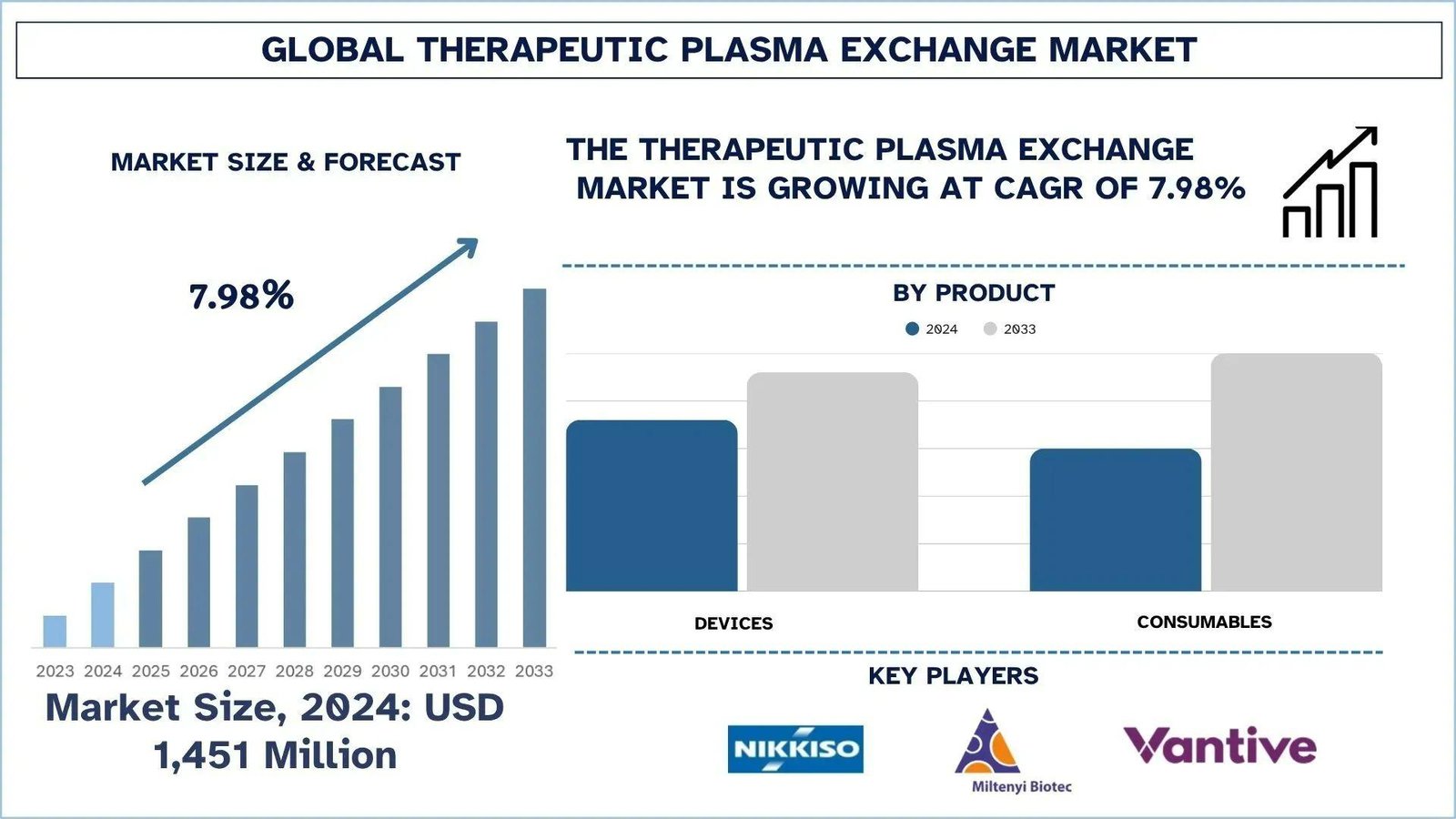 According to UnivDatos analysis, government support, technological advancements, and favorable reimbursement policies are the major factors driving the growth of the therapeutic plasma exchange market worldwide. As per their “Therapeutic Plasma Exchange Market” report, the global market was valued at USD 1,451 million in 2024, growing at a CAGR of about 7.98% during the forecast period from 2025 - 2033 to reach USD million by 2033.