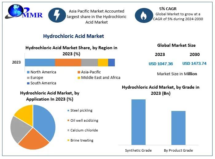 The Hydrochloric Acid Market size was valued at US$ 1047.36 Mn. in 2023 and the total revenue is expected to grow at a CAGR of 5.0% from 2024 to 2030, reaching nearly US$ 1473.74  Mn.