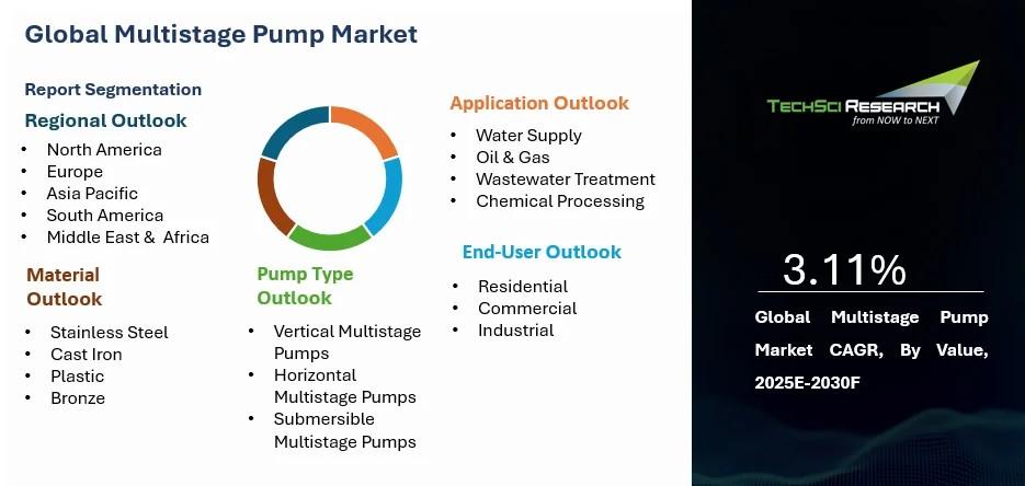 “Multistage Pump Market - Global Industry Size, Share, Trends, Opportunity, and Forecast, Segmented, By Application (Water Supply, Oil & Gas, Wastewater Treatment, Chemical Processing), By End-User (Residential, Commercial, Industrial), By Pump Type (Vertical Multistage Pumps, Horizontal Multistage Pumps, Submersible Multistage Pumps), By Material (Stainless Steel, Cast Iron, Plastic, Bronze), By Region, By Competition, 2020-2030F”, has evaluated the future growth potential of Global Multistage Pump Market and provides statistics & information on the Market size, structure, and future Market growth. The report intends to provide cutting-edge Market intelligence and help decision-makers make sound investment decisions., The report also identifies and analyzes the emerging trends along with essential drivers, challenges, and opportunities in the Global Multistage Pump Market.