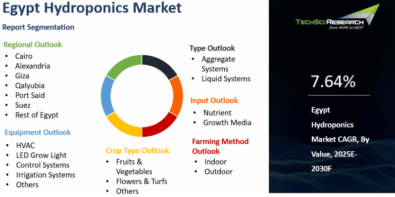 “Egypt Hydroponics Market By Type (Aggregate Systems and Liquid Systems), By Equipment (HVAC, LED Grow Light, Control Systems, Irrigation Systems, Others), By Input (Nutrient and Growth Media), By Farming Method (Indoor and Outdoor), By Crop Type (Fruits & Vegetables, Flowers & Turfs, Others), By Region, Competition, Forecast & Opportunities, 2020-2030F”, has evaluated the future growth potential of Egypt Hydroponics Market and provides statistics & information on market size, structure and future market growth. The report intends to provide cutting-edge market intelligence and help decision makers take sound investment decisions. Besides, the report also identifies and analyzes the emerging trends along with essential drivers, challenges, and opportunities in Egypt Hydroponics Market.