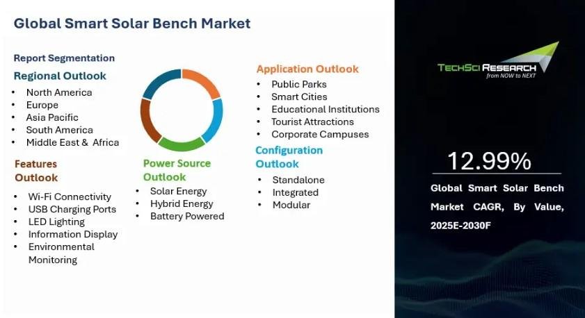 “Smart Solar Bench Market - Global Industry Size, Share, Trends, Opportunity, and Forecast, Segmented, By Application (Public Parks, Smart Cities, Educational Institutions, Tourist Attractions, Corporate Campuses), By Configuration (Standalone, Integrated, Modular), By Power Source (Solar Energy, Hybrid Energy, Battery Powered), By Features (Wi-Fi Connectivity, USB Charging Ports, LED Lighting, Information Display, Environmental Monitoring), By Region, By Competition, 2020-2030F”, has evaluated the future growth potential of Global Smart Solar Bench Market and provides statistics & information on the Market size, structure, and future Market growth. The report intends to provide cutting-edge Market intelligence and help decision-makers make sound investment decisions., The report also identifies and analyzes the emerging trends along with essential drivers, challenges, and opportunities in the Global Smart Solar Bench Market.