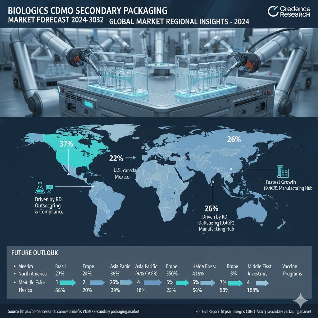 The global Biologics CDMO Secondary Packaging Market was valued at USD 2,267.62 million in 2024 and is projected to reach USD 4,465.69 million by 2032, reflecting strong industry growth, as per Credence Research. The market expansion is driven by increasing demand for biologics and vaccines, necessitating reliable secondary packaging solutions. Leading companies, including WuXi Biologics, FUJIFILM Diosynth, Samsung Biologics, Thermo Fisher Scientific, Catalent, Lonza, PCI Pharma Services, Vetter Pharma, Almac Group, Sharp, and Recipharm, dominate through advanced serialization, cold chain packaging, and patient-centric kitting solutions. North America leads with a 37% share, supported by strong outsourcing and regulatory compliance.