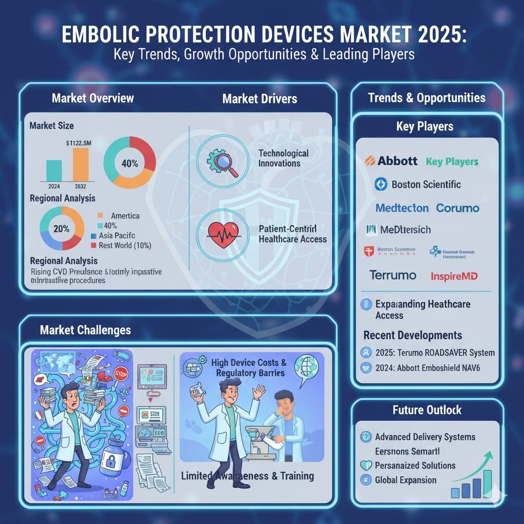 The Embolic Protection Devices Market size was valued at USD 584.5 million in 2024 and is projected to reach USD 1,122.6 million by 2032, reflecting strong growth. As per Credence Research, innovations in device design are enhancing procedural safety and efficacy during carotid artery stenting, coronary interventions, and peripheral procedures. Technological advancements, including smaller and more flexible devices, improve patient outcomes and increase adoption. The rising prevalence of cardiovascular diseases, coupled with the shift toward outpatient surgeries and preventive healthcare, accelerates demand. North America leads the market, followed by Europe, with Asia Pacific showing the highest growth potential.