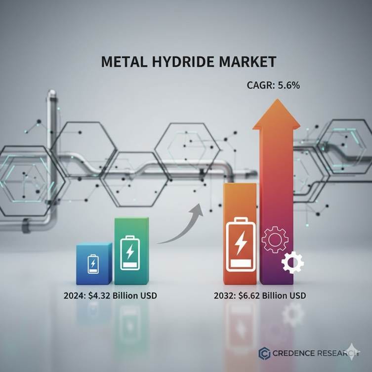 The metal hydride market was valued at USD 4.32 billion in 2024 and is projected to reach USD 6.67 billion by 2032, registering a CAGR of 5.6% during the forecast period, according to Credence Research. The market growth is driven by increasing demand for efficient energy storage solutions, advancements in hydrogen storage technologies, and expanding applications in fuel cells and automotive industries. Rising interest in sustainable and clean energy sources further supports its adoption. Technological innovations and strategic partnerships among key players continue to enhance production capabilities and market penetration, strengthening its global presence, as per Credence Research.