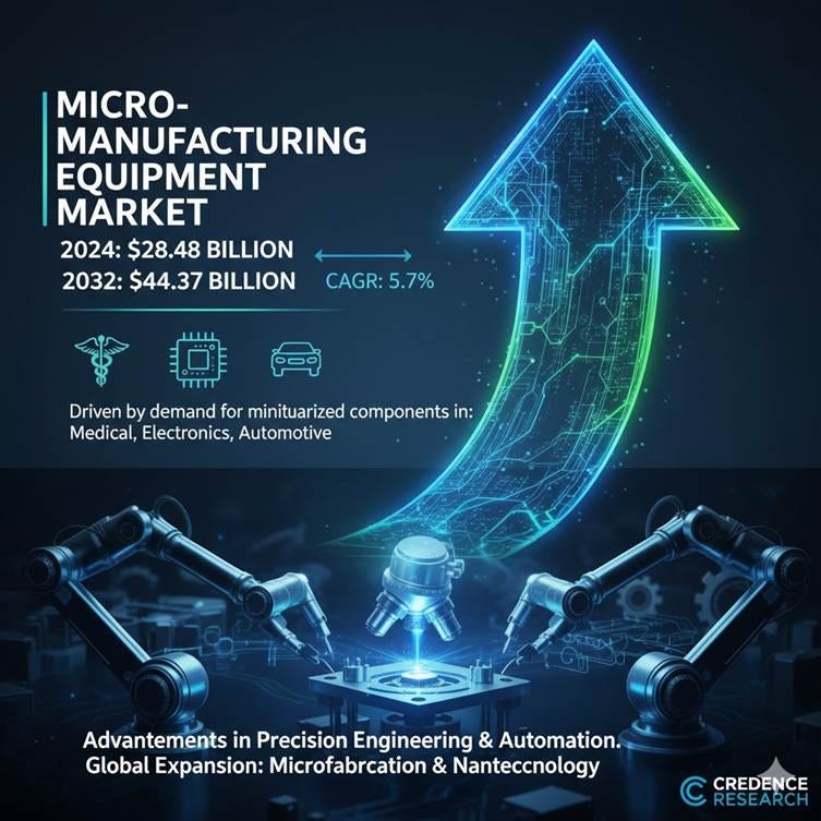 The Micro-Manufacturing Equipment Market was valued at USD 28.48 billion in 2024 and is expected to reach USD 44.37 billion by 2032, growing at a CAGR of 5.7% during the forecast period. According to Credence Research, the market growth is driven by the rising demand for miniaturized components across medical, electronics, and automotive industries. The advancement in precision engineering and automation technologies is transforming production efficiency and enabling mass customization. The market continues to expand globally with increasing adoption of microfabrication processes and nanotechnology-driven equipment in high-performance manufacturing applications.
