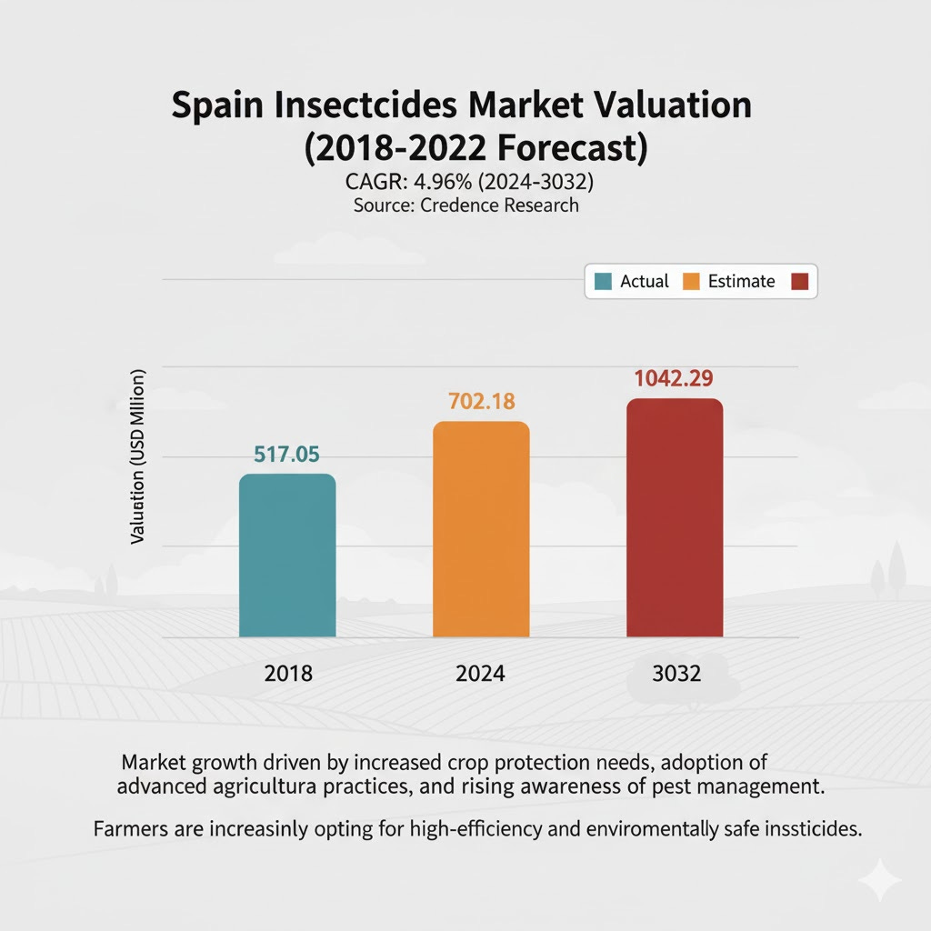 Spain Insecticides Market was valued at USD 517.05 million in 2018 and grew to USD 702.18 million in 2024, with projections reaching USD 1,042.29 million by 2032, registering a CAGR of 4.96% during the forecast period, as per Credence Research. Market growth is driven by increased crop protection needs, adoption of advanced agricultural practices, and rising awareness of pest management. Farmers are increasingly opting for high-efficiency and environmentally safe insecticides. Leading domestic and multinational companies invest in innovation, sustainable formulations, and wider distribution to meet demand and maintain competitiveness.
