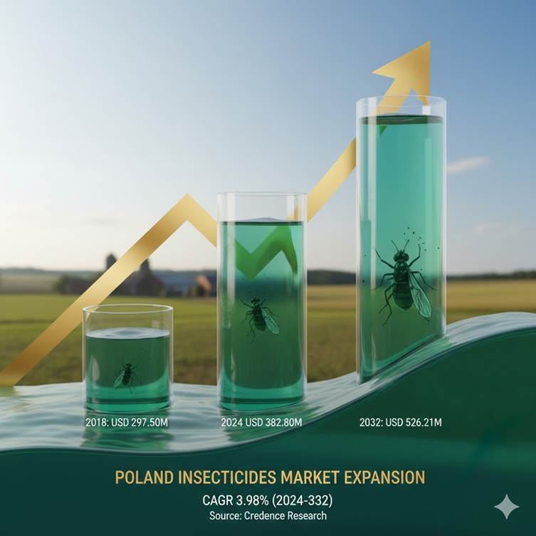 Poland Insecticides Market grew from USD 297.50 million in 2018 to USD 382.80 million in 2024 and is projected to reach USD 526.21 million by 2032, expanding at a CAGR of 3.98% during the forecast period, as per Credence Research. The market expansion is driven by rising crop protection needs, adoption of modern farming techniques, and growing pest resistance to conventional chemicals. Shifts toward integrated pest management (IPM) and environmentally safer formulations are reshaping industry dynamics. It continues to gain momentum from export-focused agriculture, precision farming adoption, and favorable government support for sustainable crop protection, as per Credence Research.