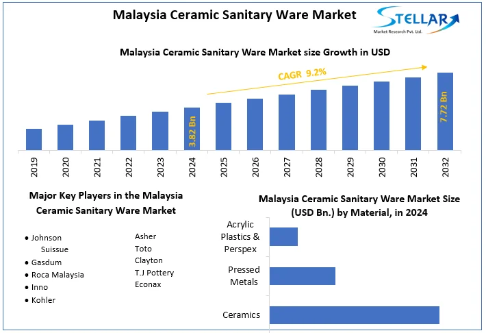The Malaysia ceramic sanitary ware market was valued at USD 3.82 billion in 2024 and is projected to reach USD 7.72 billion by 2032, growing at a compound annual growth rate (CAGR) of 9.2% from 2025 to 2032.