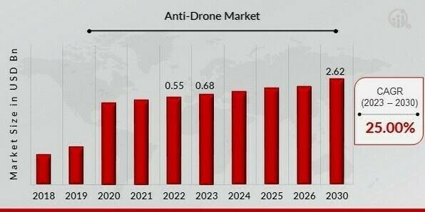 The Anti-Drone Market has witnessed significant growth in recent years, driven by the rising adoption of counter-drone technologies across various industries. Valued at USD 0.55 billion in 2023, the market is projected to grow at an impressive compound annual growth rate (CAGR) of 25.00% during the forecast period of 2024 to 2032. By 2032, the market size is expected to reach USD 2.6226 billion. This remarkable growth is fueled by advancements in technology and increasing concerns over unauthorized drone activities in both professional and recreational domains.