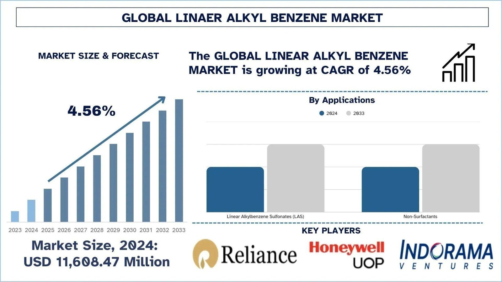 According to UnivDatos analysis, the rising global demand for biodegradable products, coupled with the increasing mergers & acquisitions of manufacturing firms by big brands, are the major factors driving the growth of the linear alkyl benzene market. As per their “Linear Alkyl Benzene Market” report, the global market was valued at USD 11,608.47 million in 2024, growing at a CAGR of about 4.56% during the forecast period from 2025 - 2033 to reach USD million by 2033.