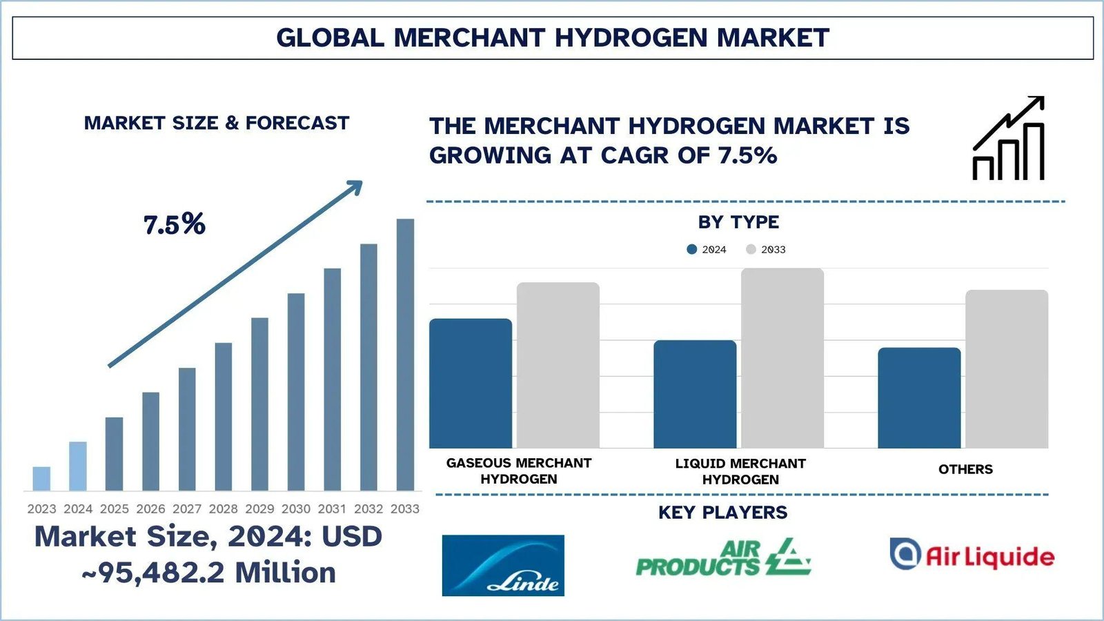 According to UnivDatos analysis, rising demand for clean energy, government incentives and funding for hydrogen production, and technological advancements are the major factors driving the global growth of the merchant hydrogen market. As per their “Merchant Hydrogen Market” report, the global market was valued at USD ~95,482.2 million in 2024, growing at a CAGR of about 7.5% during the forecast period from 2025 - 2033 to reach USD million by 2033.