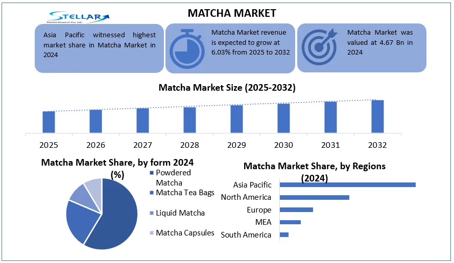 Asia-Pacific leads the matcha market due to cultural origin (Japan), strong domestic consumption, and increasing production/export. The Asia-Pacific matcha market alone was valued at USD 2.76 billion in 2024 and is projected to reach USD 4.25 billion by 2032 (CAGR ~6.32%).