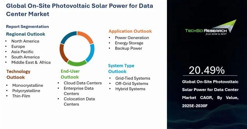 “On-Site Photovoltaic Solar Power for Data Center Market - Global Industry Size, Share, Trends, Opportunity, and Forecast, Segmented, By Application (Power Generation, Energy Storage, Backup Power), By System Type (Grid-Tied Systems, Off-Grid Systems, Hybrid Systems), By End-User (Cloud Data Centers, Enterprise Data Centers, Colocation Data Centers), By Technology (Monocrystalline, Polycrystalline, Thin-Film), By Region, By Competition, 2020-2030F”, has evaluated the future growth potential of Global On-Site Photovoltaic Solar Power for Data Center Market and provides statistics & information on the Market size, structure, and future Market growth. The report intends to provide cutting-edge Market intelligence and help decision-makers make sound investment decisions. The report also identifies and analyzes the emerging trends along with essential drivers, challenges, and opportunities in the Global On-Site Photovoltaic Solar Power for Data Center Market.