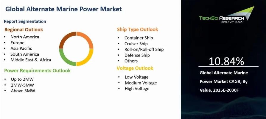 “Alternate Marine Power Market - Global Industry Size, Share, Trends, Opportunity, and Forecast, Segmented, By Ship Type (Container Ship, Cruiser Ship, Roll-on/Roll-off Ship, Defense Ship, Others), By Voltage (Low Voltage, Medium Voltage, High Voltage), By Power Requirements (Up to 2MW, 2MW-5MW, Above 5MW), By Region, By Competition, 2020-2030F”, has evaluated the future growth potential of Global Alternate Marine Power Market and provides statistics & information on the Market size, structure, and future Market growth. The report intends to provide cutting-edge Market intelligence and help decision-makers make sound investment decisions. The report also identifies and analyzes the emerging trends along with essential drivers, challenges, and opportunities in the Global Alternate Marine Power Market.