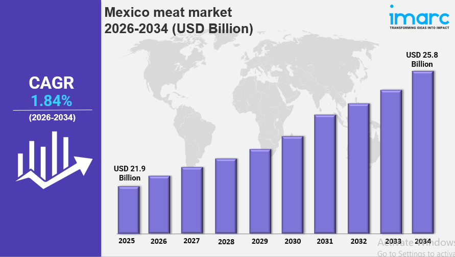 The Mexico meat market size reached USD 21.9 Billion in 2025. It is forecasted to grow to USD 25.8 Billion by 2034, registering a CAGR of 1.84% during the forecast period of 2026-2034. The market growth is supported by rising production, evolving consumer preferences, and expanding distribution networks, while maintaining high standards in quality, regulatory compliance, and supply chain efficiency.
