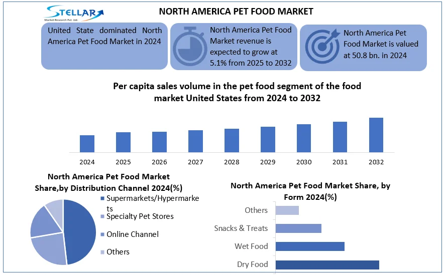 The North America pet food market reached a valuation of USD 50.8 billion in 2024, according to Stellar Market Research, and is projected to grow at a compound annual growth rate (CAGR) of 5.1% from 2025 to 2032, culminating at USD 75.63 billion by 2032.