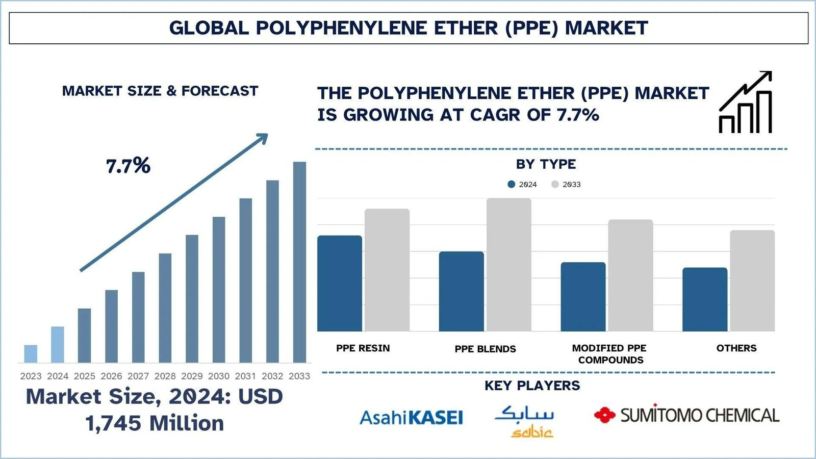 According to UnivDatos analysis, the rising adoption of high-performance engineering plastics in consumer and industrial applications is the major factor driving the growth of the Polyphenylene Ether (PPE) market. As per their “Polyphenylene Ether (PPE) Market” report, the global market was valued at USD 1,745 million in 2024, growing at a CAGR of about 7.7% during the forecast period from 2025 - 2033 to reach USD million by 2033.