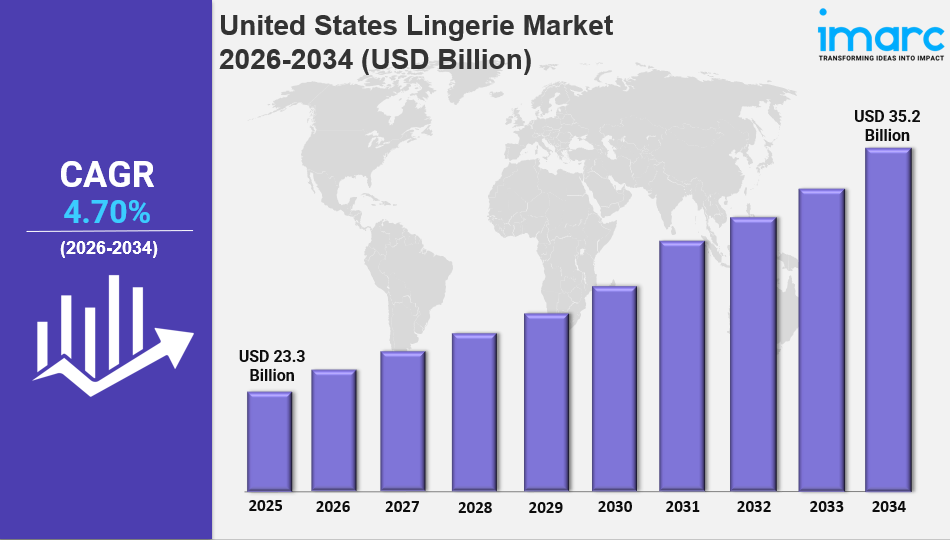 IMARC Group has recently released a new research study titled “United States Lingerie Market Report by Product Type (Brassiere, Knickers or Panties, Shapewear, and Others), Material (Cotton, Silk, Satin, Nylon, and Others), Price Range (Economy, Premium), Distribution Channel (Mass Merchandizers, Specialized Stores, Online Stores, and Others), and Region 2026-2034”, offers a detailed analysis of the market drivers, segmentation, growth opportunities, trends and competitive landscape to understand the current and future market scenarios.