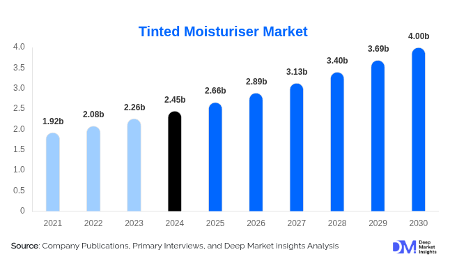 According to Deep Market Insights, the global Tinted Moisturiser Market size is projected to grow from USD 2.66 billion in 2025 to reach USD 4 billion by 2030, expanding at a CAGR of 8.5% during the forecast period (2025–2030).