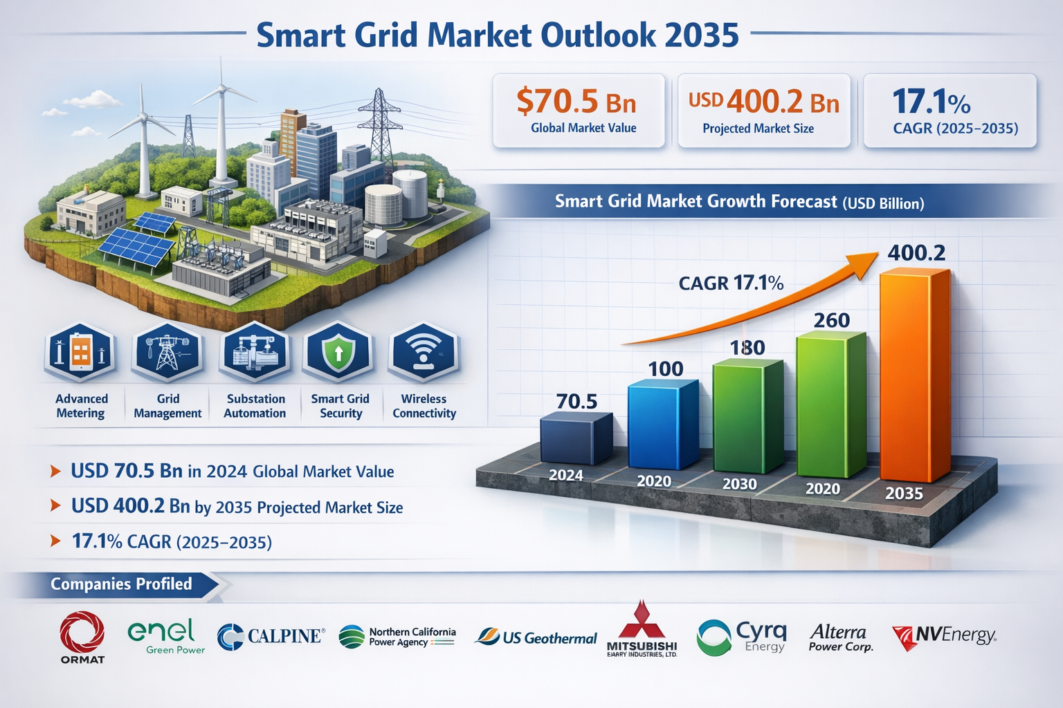 The global smart grid market was valued at USD 70.5 Bn in 2024 and is projected to reach USD 400.2 Bn by the end of 2035, expanding at a robust CAGR of 17.1% from 2025 to 2035. Market growth is driven by rising investments in grid modernization, increasing integration of renewable energy sources, growing demand for energy efficiency, and the adoption of advanced metering infrastructure (AMI) and digital grid technologies. Supportive government policies and the accelerating shift toward decentralized power generation are further strengthening the market outlook through 2035.