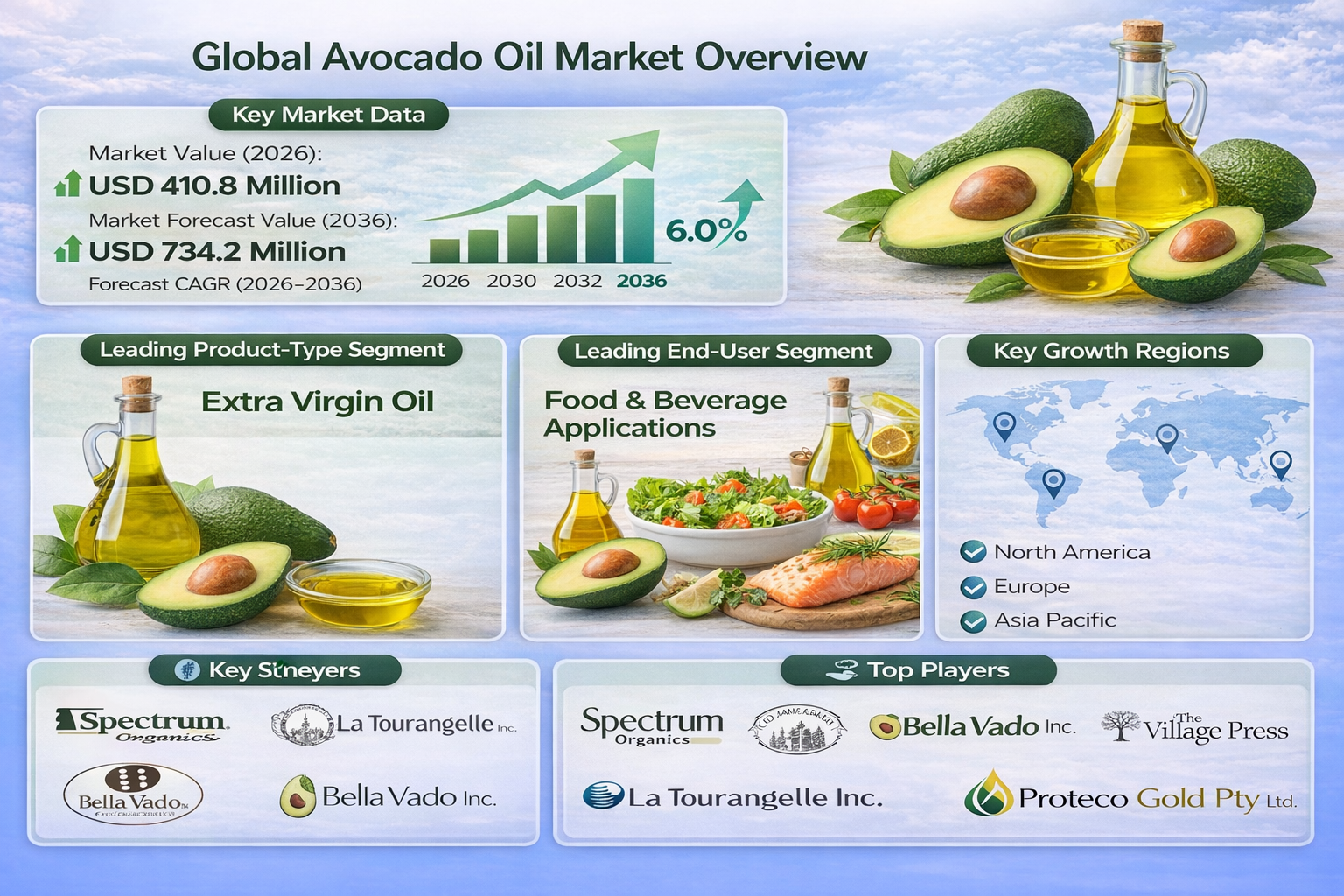 The avocado oil market exemplifies how consumer awareness, premiumization, and cross-industry applications can reshape a traditional agricultural product into a high-value global category.