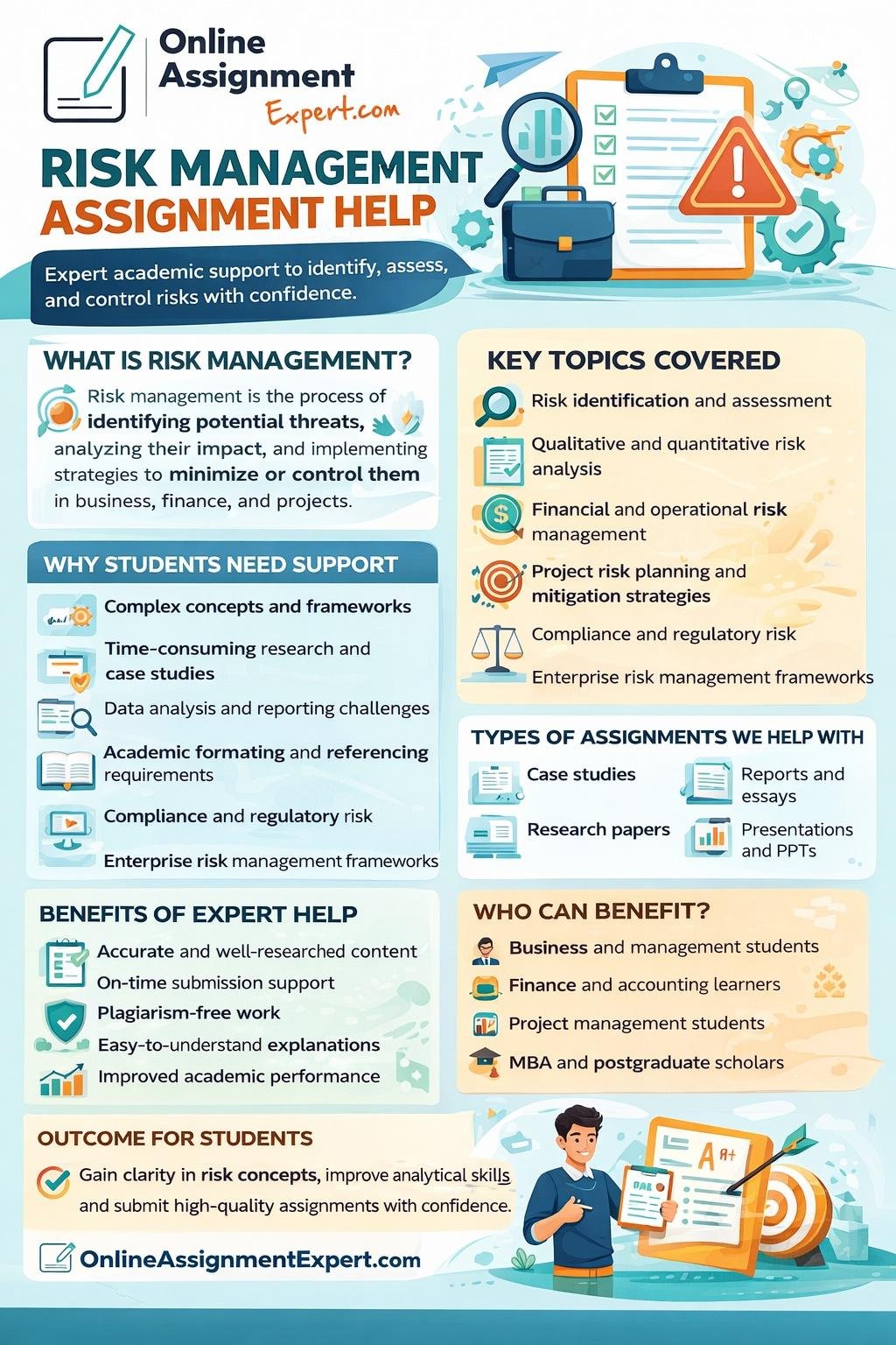 Get professional risk management assignment help designed to simplify complex concepts and improve academic performance. Our experts assist with risk identification, assessment techniques, mitigation strategies, case studies, reports, and research papers across business, finance, and project management subjects. Receive well-researched, plagiarism-free content, accurate analysis, and timely delivery tailored to university standards. Whether you’re working on qualitative or quantitative risk analysis, compliance topics, or enterprise risk frameworks, this service ensures clarity, structured writing, and better grades through reliable academic guidance.